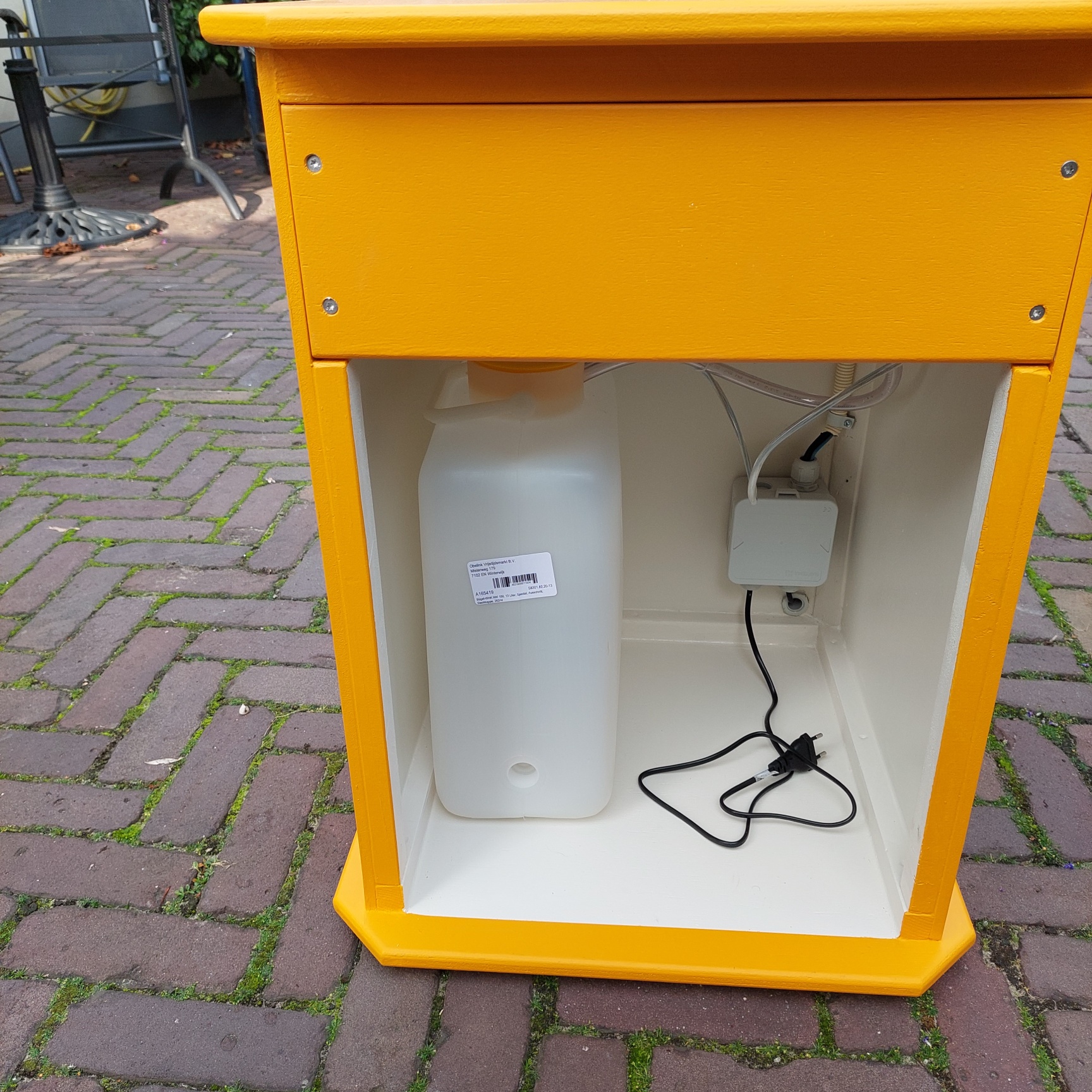 Met een 10 liter tank waar een dompel pompje in zit van 12 volt